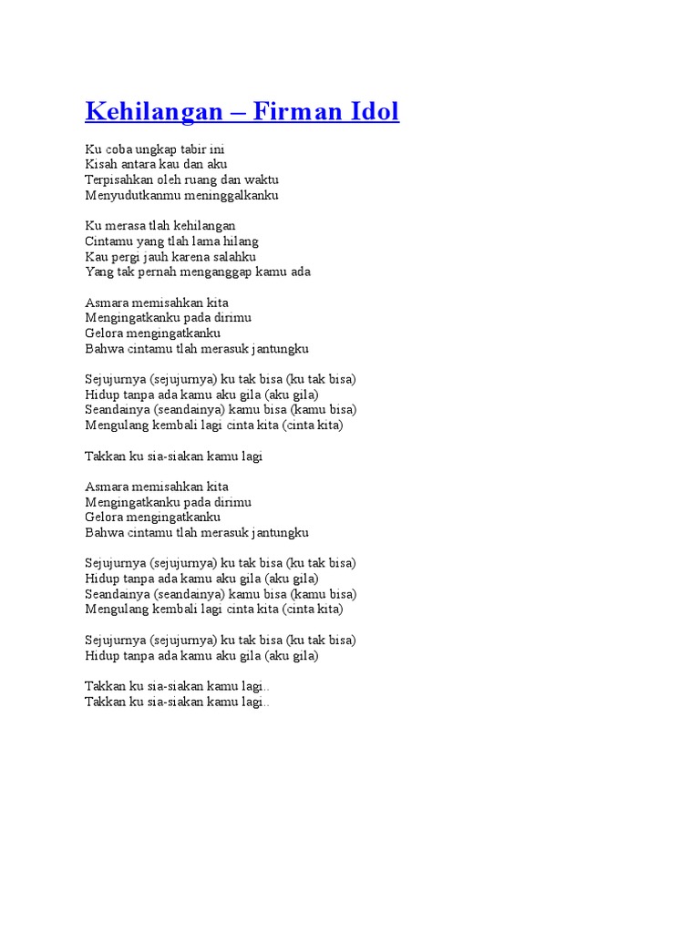 Sejujurnya ku tak bisa hidup tanpa ada kamu. Ku coba ungkap tabir ini kisah antara kau dan aku terpisahkan oleh ruang dan waktu menyudutkanmu meninggalkanku ku merasa tlah kehilangan cintamu yang tlah lama hilang kau pergi jauh karena salahku yang tak pernah menganggap kamu ada asmara memisahkan kita mengingatkanku pada dirimu gelora mengingatkanku bahwa cintamu tlah merasuk jantungku reff. Sejujurnya ku tak bisa g c e hidup tanpa ada kamu aku gila am dm seandainya kamu bisa g c mengulang kembali lagi cinta kita dm e am takkan ku sia siakan kamu lagi intro. Chord gitar chord gitar lagu kehilangan firman. Sejujurnya ku tak bisa g c e hidup tanpa ada kamu aku gila am dm seandainya kamu bisa g c mengulang kembali lagi cinta kita dm e am takkan ku sia siakan kamu lagi.